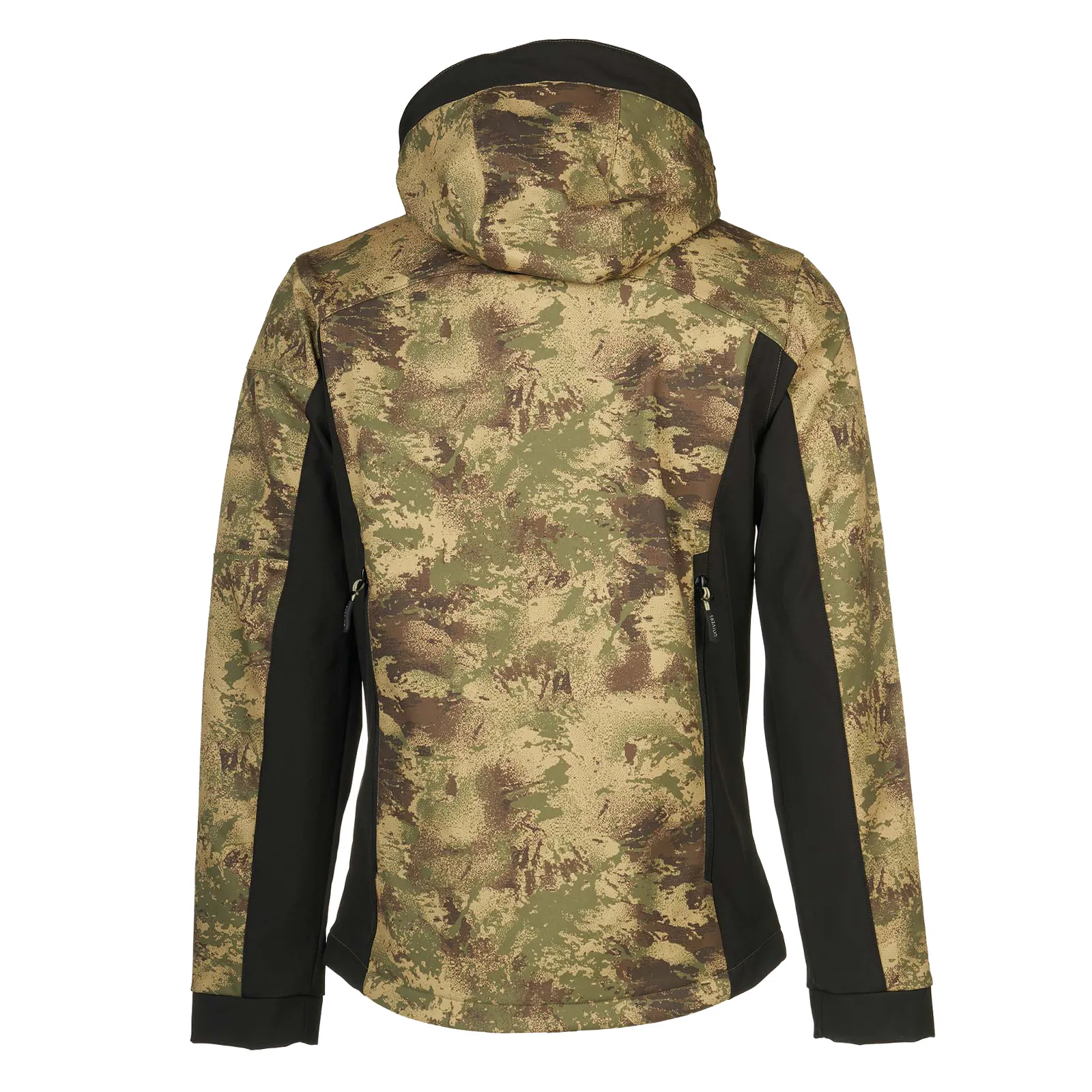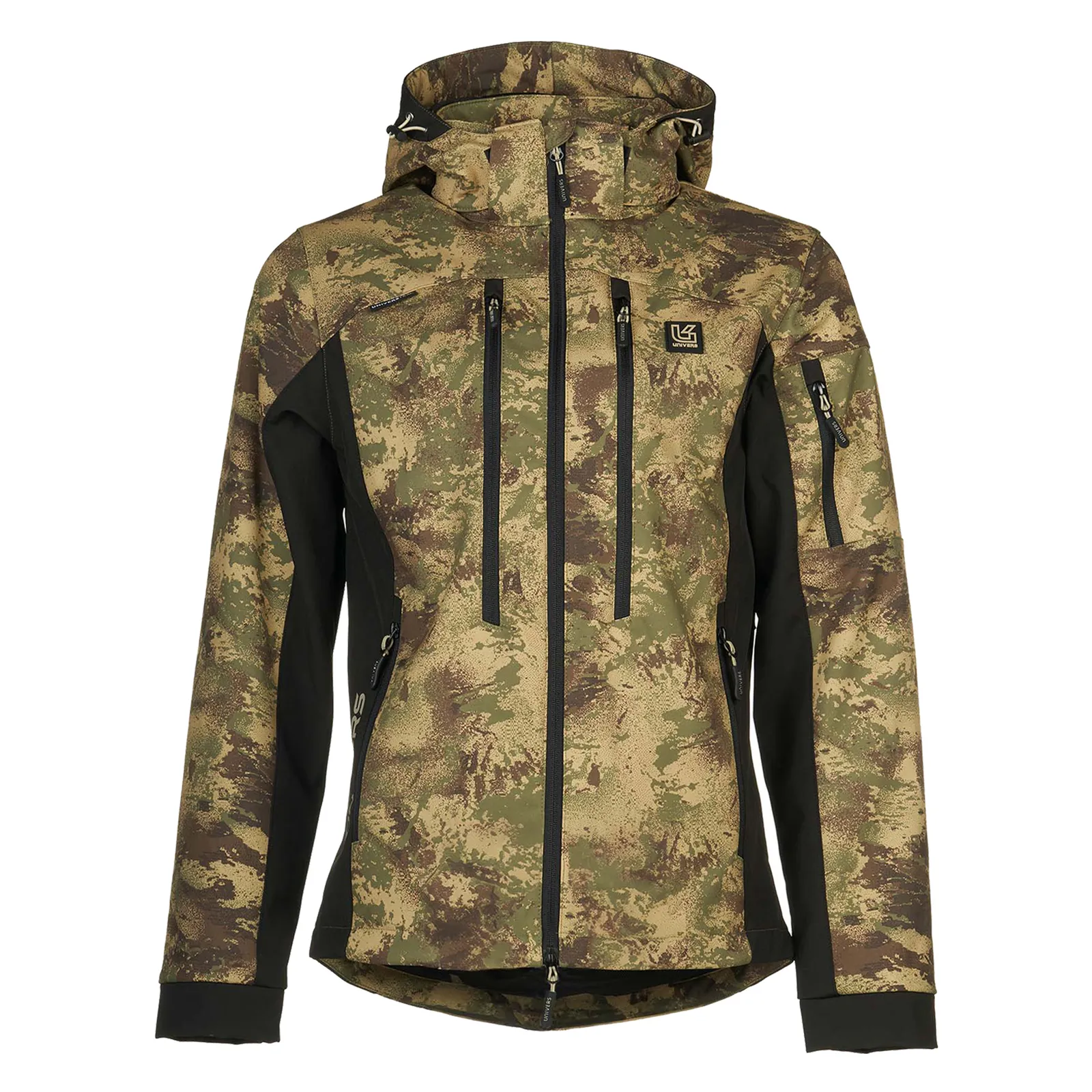 Giacca da caccia con effetto "camo digitato", realizzata in morbido e caldo softshell elasticizzato doppiato con pile e membrana impermeabile e traspirante Univers-tex.