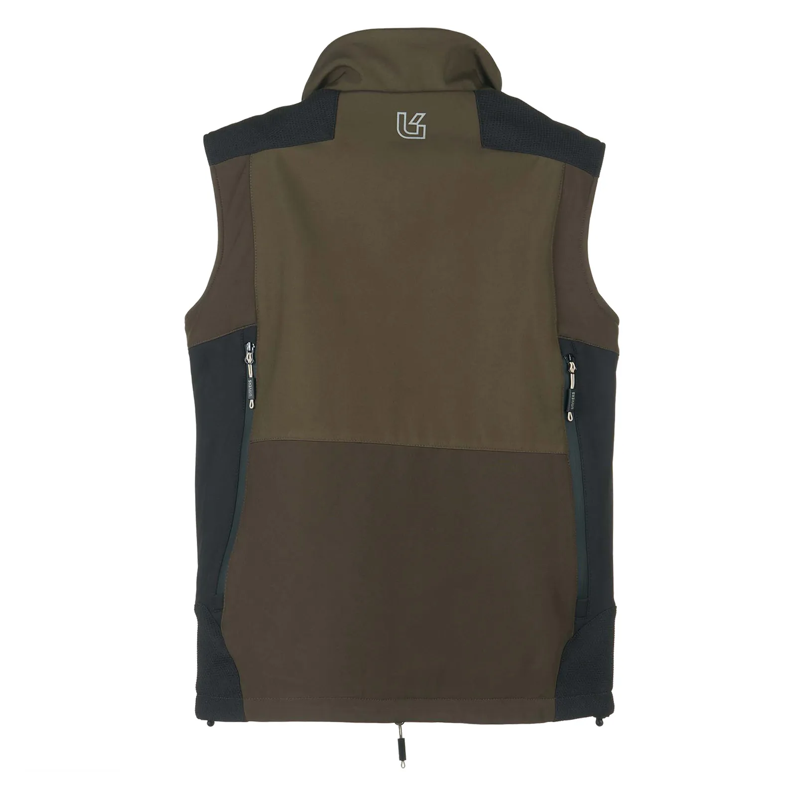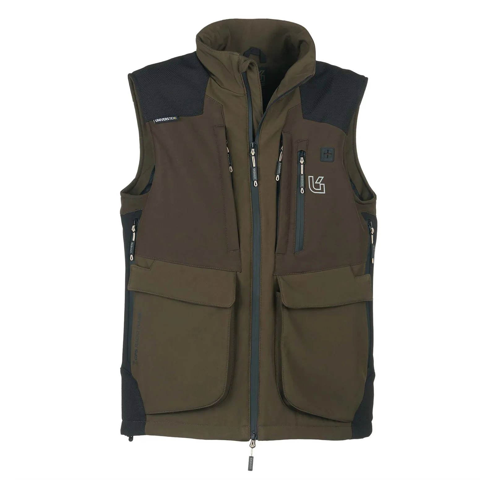 Gilet da caccia in morbido e caldo softshell elasticizzato foderato con pile e membrana impermeabile e traspirante Univers-tex, dotato di 2 tasche frontali a soffietto con pattina e foro per antenna che possono essere utilizzate anche come porta satellitare, 2 capienti tasche da riposo a zip, 3 tasche sul petto di cui una porta GPS, tasca interna ed ampio carniere posteriore.