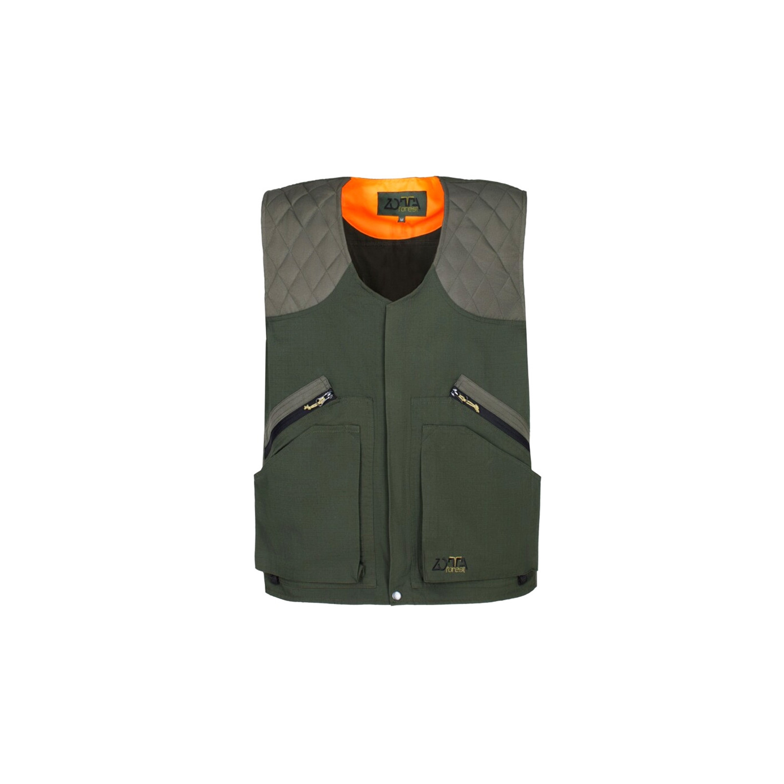Gilet in ripstop ad alta tenacità idrorepellente con spalle imbottite e rinforzate, tasca interna, due tasche a zip sul torace e due tasconi frontali, ampio carniere posteriore a doppia entrata.