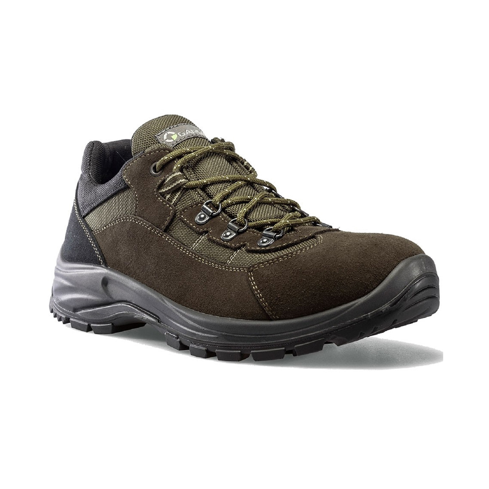 Tomaia in crosta scamosciata e nylon, intersuola in feltro strong, sottopiede estraibile ed anatomico, suola in PU doppia densità iniettato e fodera air mesh.