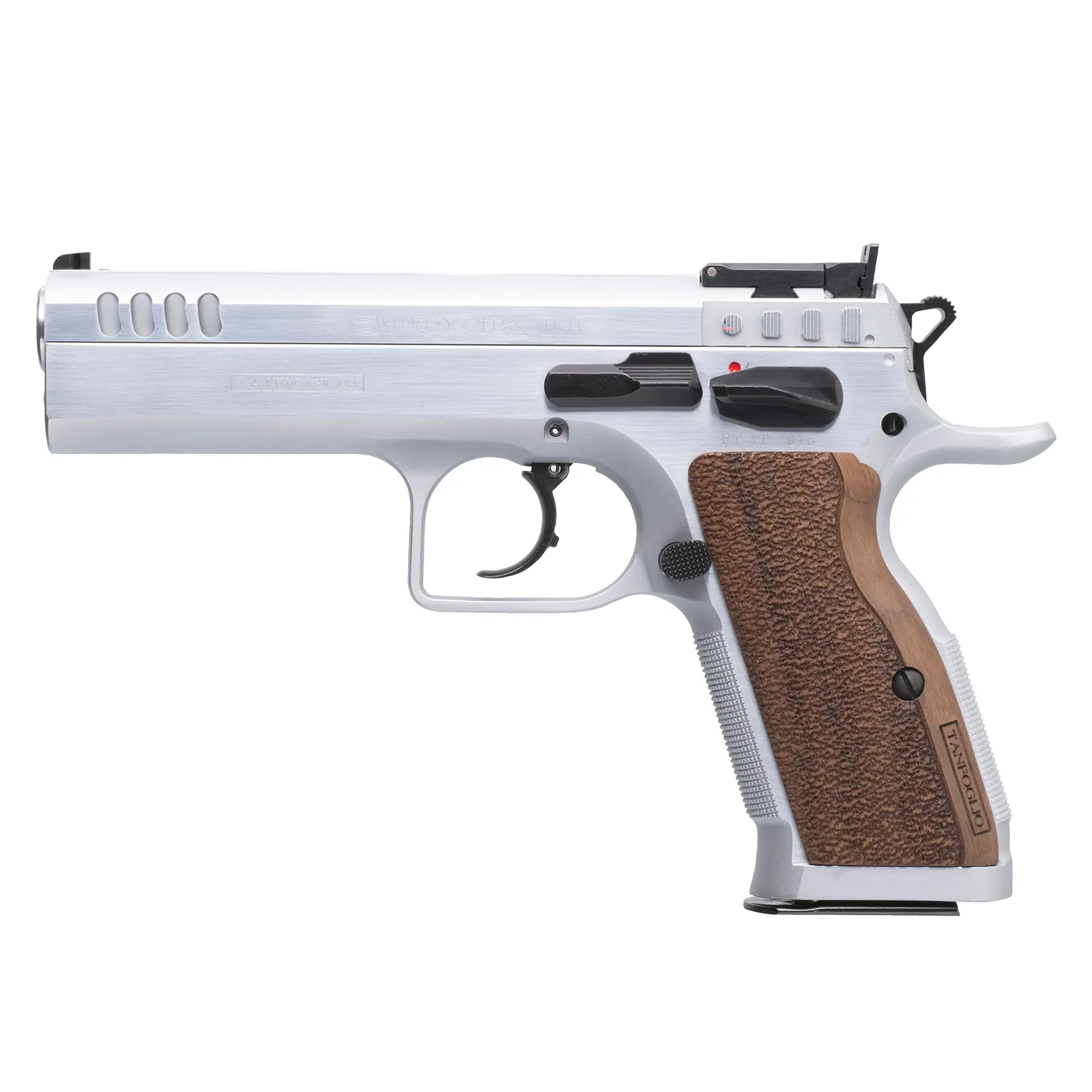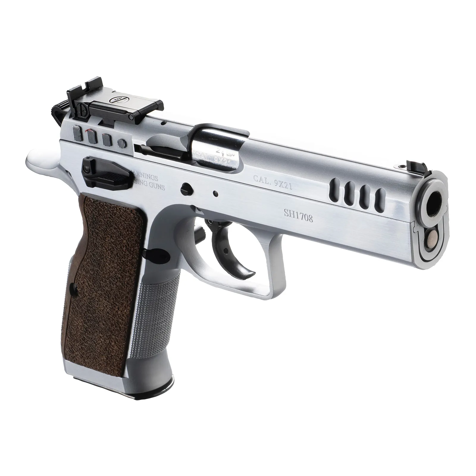 Canna da 11.3 cm, caricatore da 16 colpi, fusto e carrello in acciaio, sicura automatica al percussore e manuale sul fusto, funzionamento in doppia azione, lunghezza totale di 21.7 cm e peso di 1200 g.