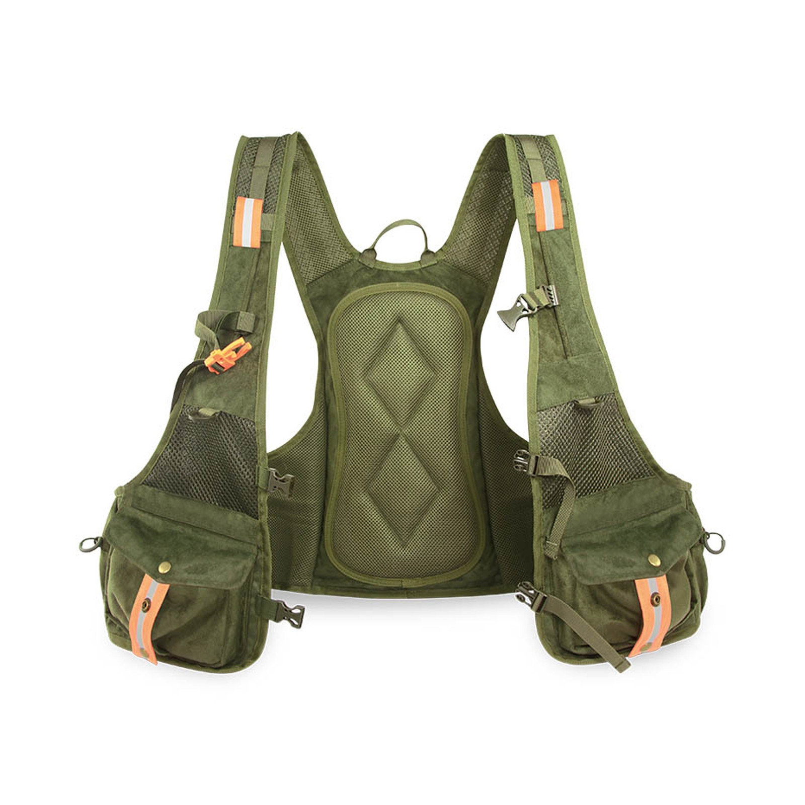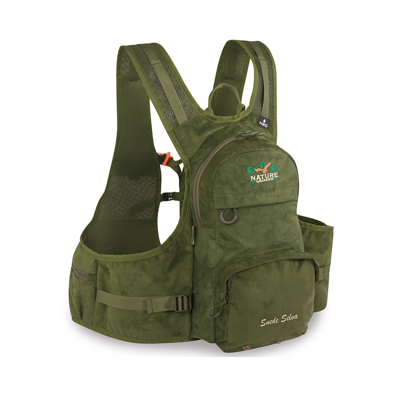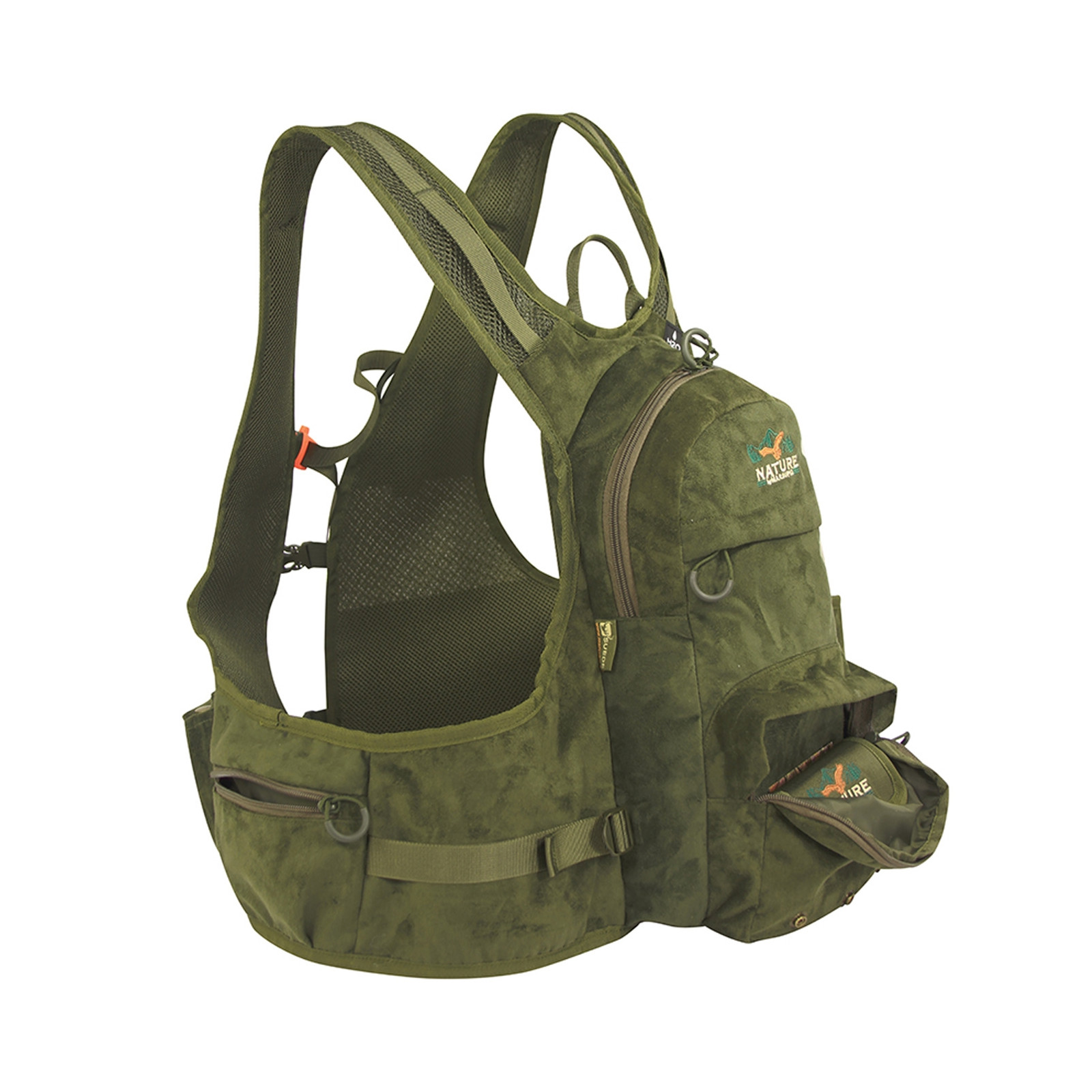 Nuovo gilet per gli amanti della caccia e della pesca. Realizzato interamente in tessuto SUEDE ed adattabile ad ogni corporatura grazie ai due nastri di compressione laterali. Spallacci in rete dotati di cinturino pettorale scorrevole con fischietto e dorso imbottito traspirante. Zainetto posteriore di capienza 12 lt, comodo e capiente con una tasca spaziosa frontale.